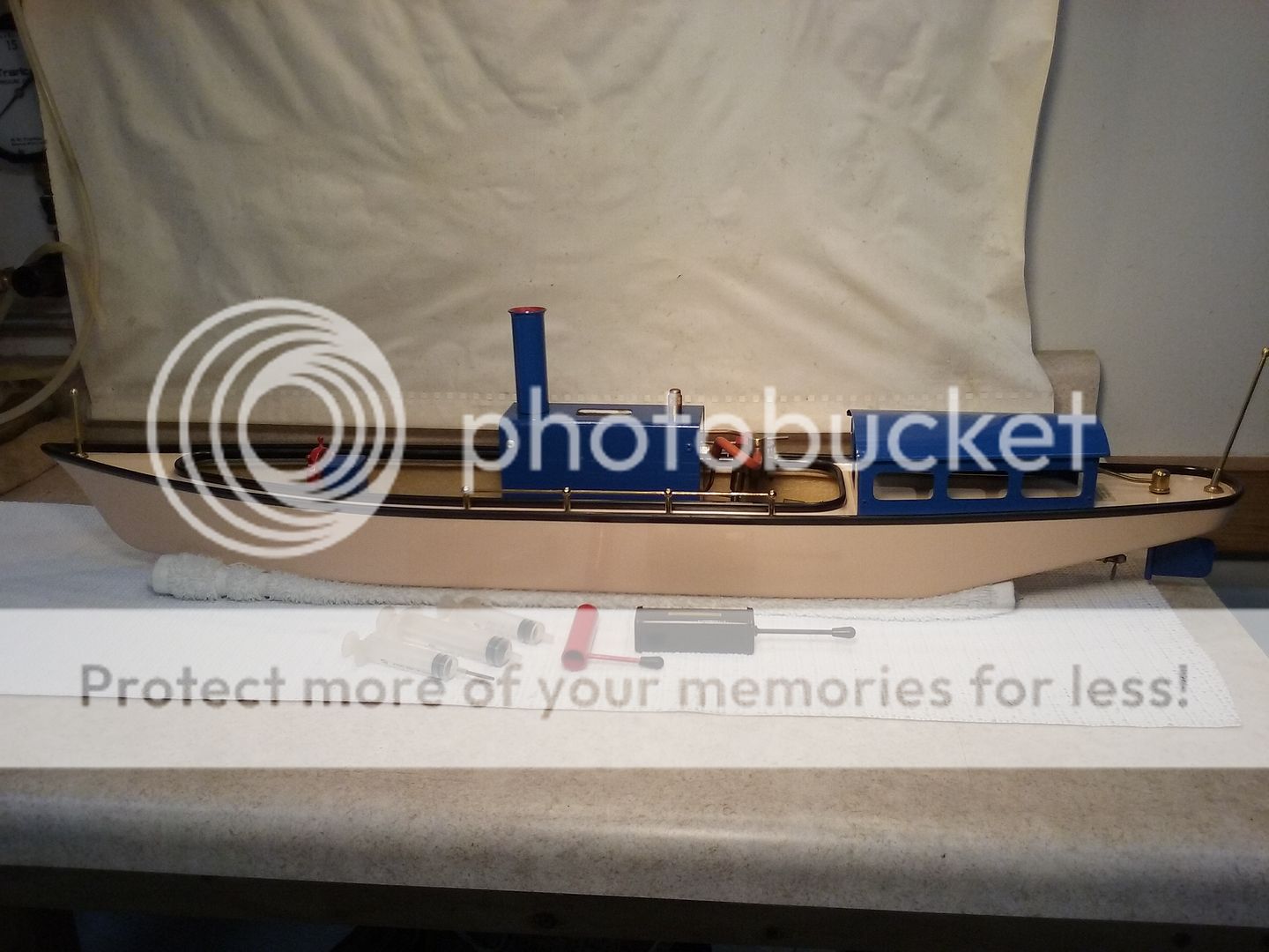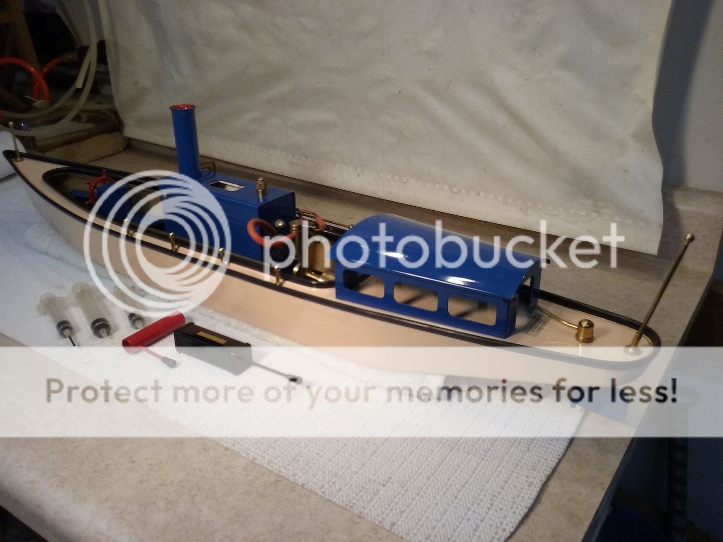 5. 1/2" across, 4. 1/2" tall at the boiler & 7. 1/4" tall at the smoke stack, she weighs 5.4 lbs. it has a very nicely laid fiberglass hull & she cuts a handsome shape. I can tell she's unfired from the Lilly white insulation around the firebox, the new looking & unfired burner & the safety valve, the prior owner also told me it was unfired (I always prove this to myself though) she has very few blemish's ....a few scratches on the cabin roof , a couple of tiny smudges on the hull , but probably the most "sound" unfired vessels of this type that I will ever have the pleasure of owning again. she has a red apparatus  that I am not sure of the use, but firmly believe it belongs with this vessel, it also has 3 plunge type syringes that after viewing other articles about this vessel I'm quite sure they are part of the original package.