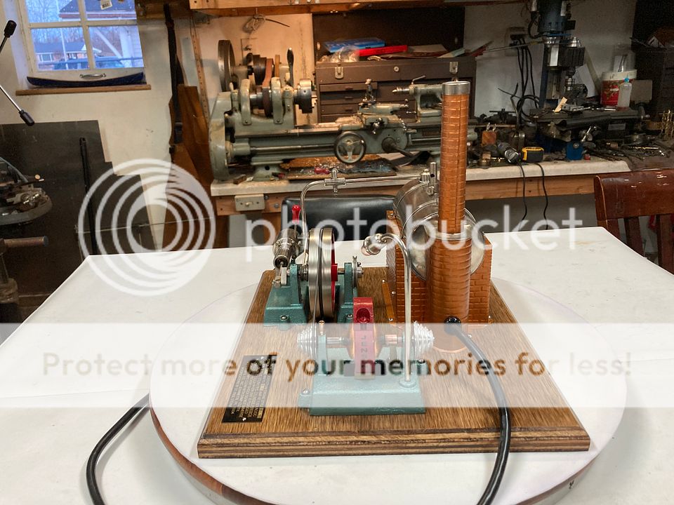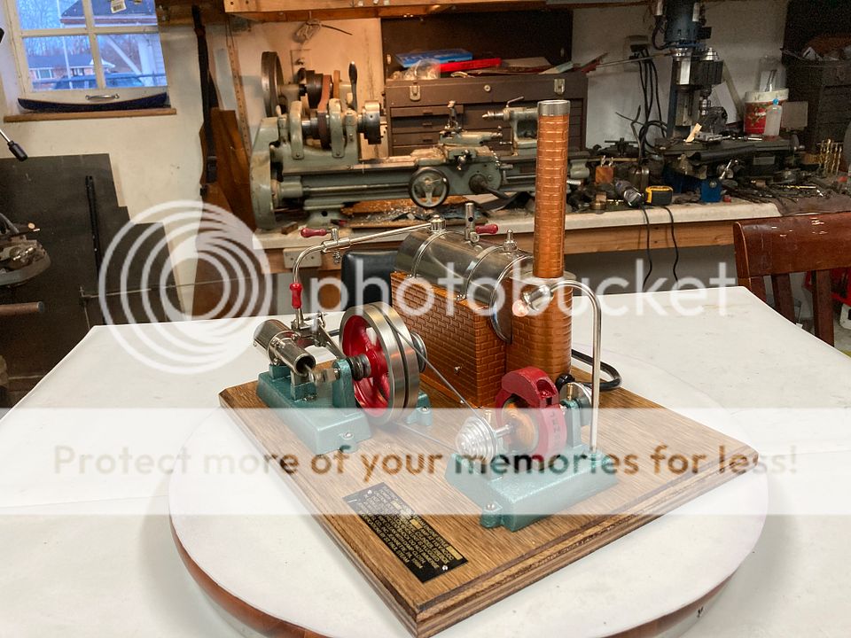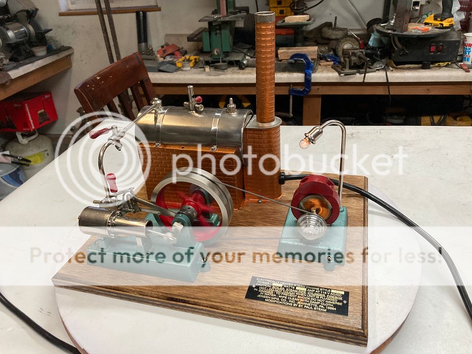 here we have a 1970's Jensen #20G that has been restored to better than new condition, I changed out the old boiler for the Immersion rod 660 Hotwatt heater style, the firebox, chimney stand & chimney have all been bead blasted & repainted with vht "burnt copper' paint, the engine & generator cast iron bases have also been stripped & repainted with Verde green hammer tone paint. the #20 engine now has sealed roller ball bearings in the stanchions & is super smooth now. the generator has had the axle replaced with a longer one & (2) 4 tiered internally knurled pulleys have been installed along with (2) brass oilers on top of the stanchions. A new plinth was made (3/4" thick) and a new brass tag has been affixed. it runs very well (in both directions).