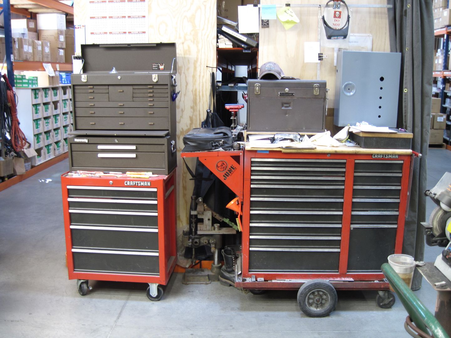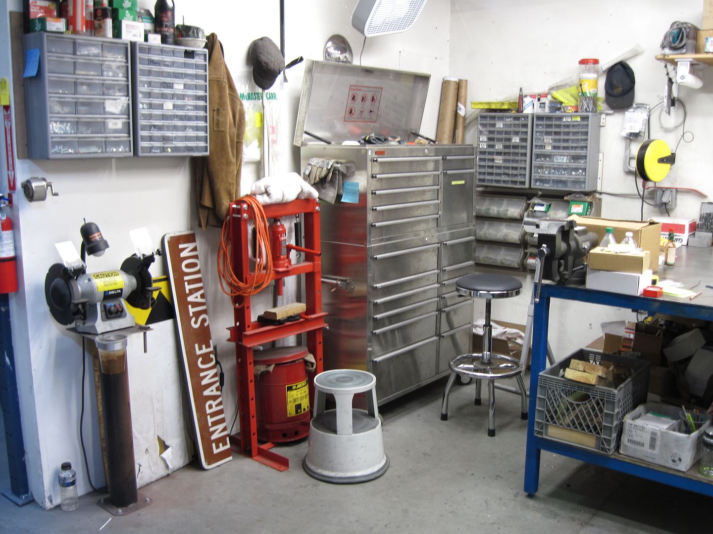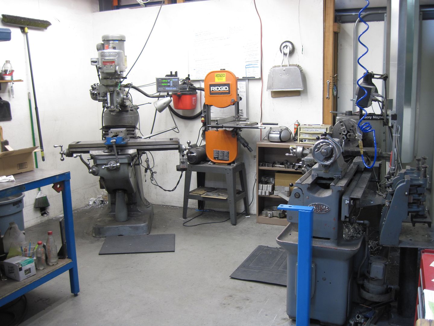 Second picture, left to right: South Bend drill press, Gerstner tool chest, S & D drills, manetizer/demagnetizer, surface plate, misc. round stock, and world's crappiest bench grinder: