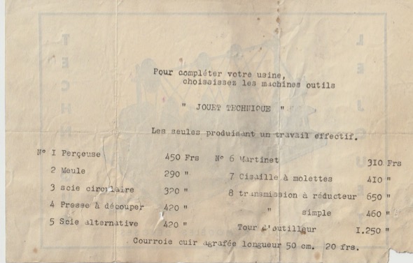 On the backside is where it gets interesting. Although I find the prices hard to believe, considering these drive models were likely made around 1960. Also, that's assuming "frs" stands for French francs, which were worth around 20 cents in 1960. So, that would make the original price of the scie circulaire, which is listed at 320 francs to be $64. I don't think that's right. That would be a week's ages for a worker back then. I think the price was likely about 1/10th of that. Anyway, here is what is typed on the reverse of the insert. I'll let you do your own translations.