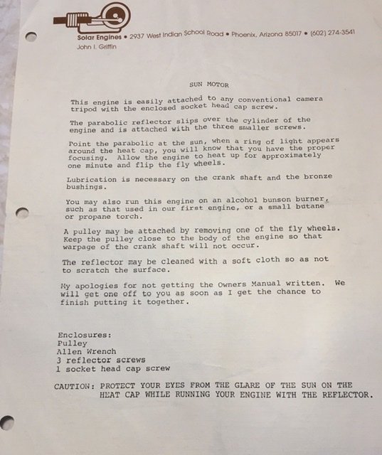 https://www.papa-mike.com/about-us/Methinks the “Thermal Energy Engine” may be just an early mold stamp/embossing of the Solar Engine Phoenix Company. Perhaps same company simply using 2+ different simultaneous molds for the same engine. Thermal Energy Engine may have been what the Griffins’ (or Ed Morgan) first thought to name that Phoenix Solar engine, and quickly changed their minds to the hot-topic 1977 buzz word of “Solar Engine” ? Same company , two molds, same engine. Why waste a good mold ? The reason I think this is I can find no literature or business data for Thermal Energy Engines in Phoenix Az in mid-1970’s. To sell a toy engine in the 1970’s you had to somehow advertise it, then have a mail order address to send it from. 1977 toy Stirling engine sales from the back pages of pulp magazines had to be pretty limited and it is amazing that Solar (or Thermal) could mail-order sell thousands a year. IF someone produces actual sales or tech literature for the Thermal Energy Engine , well that blows away my aforementioned theory.