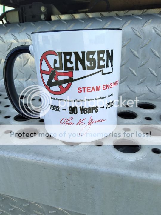 Your confusion is understandable Nick , on a return trip from cabin fever some 2 or 3 years ago, 4 of us stopped by Jensen Mfg. To visit , show some of our vintage engines and such , I had made up some mugs for Tom G. Dorita, Andy & Alita with the Jensen logo and their names on them , well I guess they liked them well enough to ask me to come up with a 90 anniversary style mug around last September , I offered several