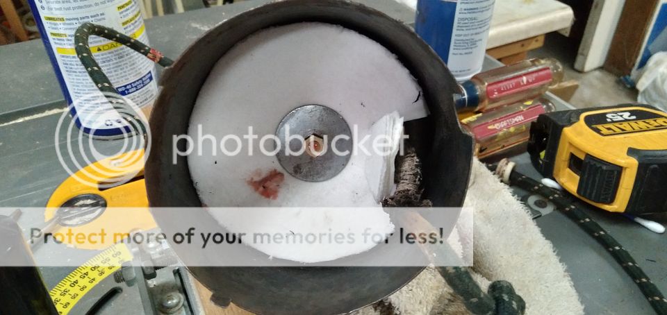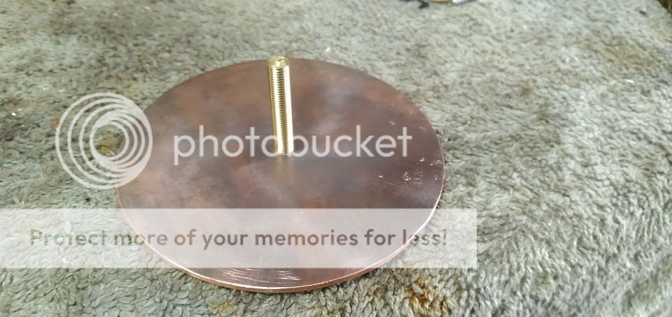 This is a photo of it pretty well opened up, I have not cleaned it yet in this photo, but the area to be soldered was cleaned down to the metal. I use the highest temp soft solder there is (Stay-Bright #8) melts at 430F & flows at 530F so double the temperature of steam. the copper plate was gleaned from a copper pipe, cut, split & heated flat, cleaned up on my lathe, center hole drilled & tapped 3/16" x 40 tpi with a 3/16"x40tpi brass 1" threaded rod soldered to the plate to hold down the heater. it is important to use plenty of flux to purge the impurities out of the join. I used a wet cloth around the perimeter of the boiler (held in place with a large radiator clamp) in an effort to save the paint & not cause to much discoloration. the hardest part was cutting the circle out of the boiler, I ended up using a small right angle drill bit holder with a Dremel cutoff disc mounted in the chuck, Dremel cutoff discs don't like going that slow...so I went through quite a few before the hole was made. I cleaned the edge up with a Dremel grinding wheel.