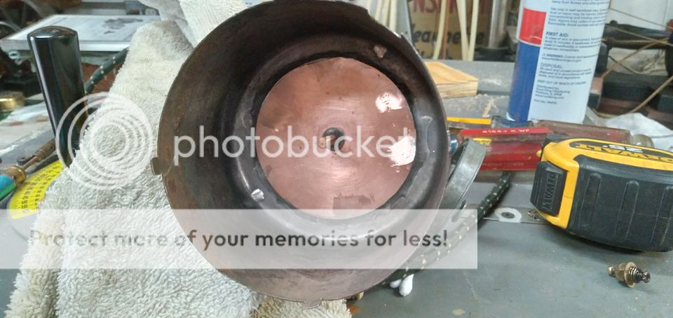 I tested it for soundness really thoroughly before I spent any significant time repairing it, the remaining shell is quite thick & I bead blasted the inside of the boiler thoroughly as well, I'm not concerned about the rest of it.it now has a 2mm thick copper bottom underneath it slightly larger than the original heater. 275 ml. seems to be the empty fill capacity to keep the water level just below the intake for the cylinder assembly.